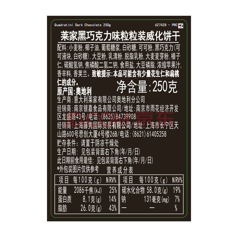 商品名称:莱家loacker黑巧克力味威化饼干250g进口休闲上班解馋早餐下午茶零食