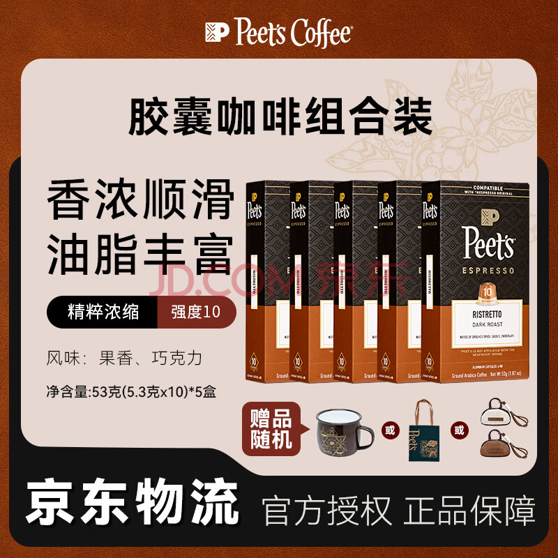 > Peet's Coffee皮爷peets胶囊咖啡50颗装(强度10*5+随机品牌周边*1)法国进口