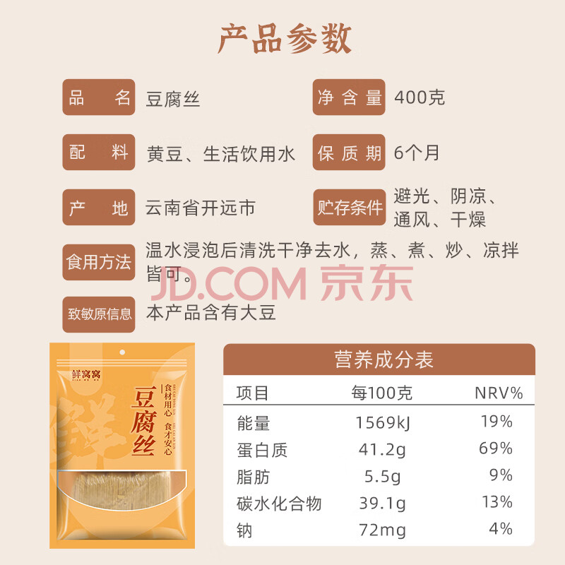 商品名称:鲜窝窝 豆腐丝400g 豆制品干货石屏云丝火锅食材 千张豆皮腐竹素食凉菜