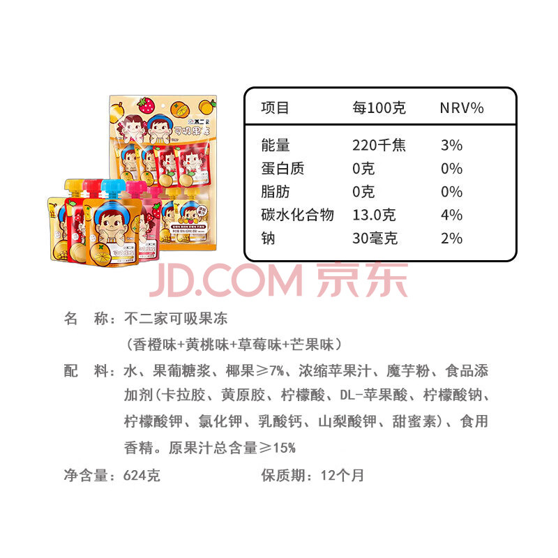 商品名称:不二家 草莓+芒果+香橙+黄桃味 可吸果冻624g(8袋)儿童饮料糖果零食
