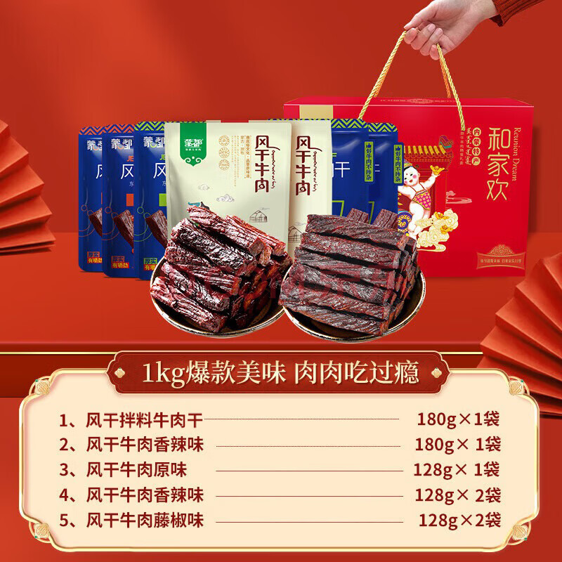 蒙都 合家欢风干纯牛肉礼盒 1000g 盒装 肉干肉脯 休闲零食 送礼 清真