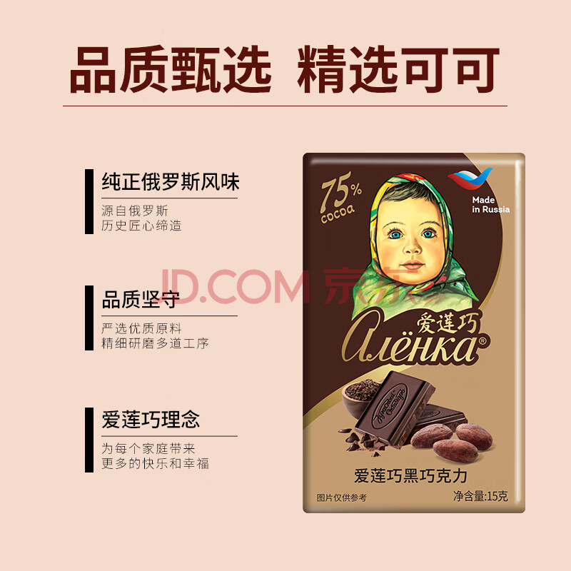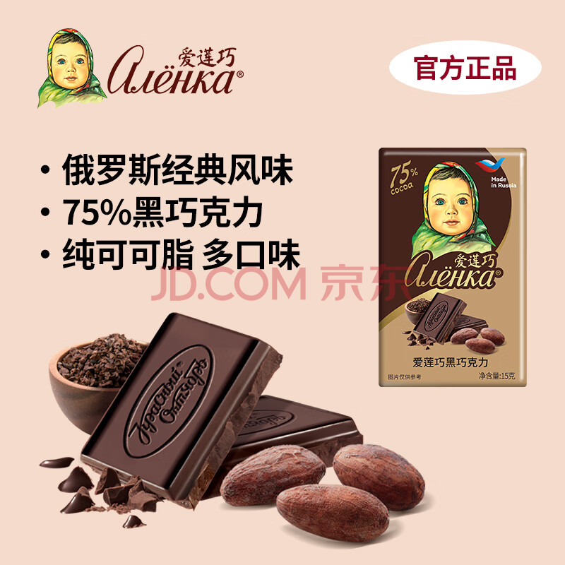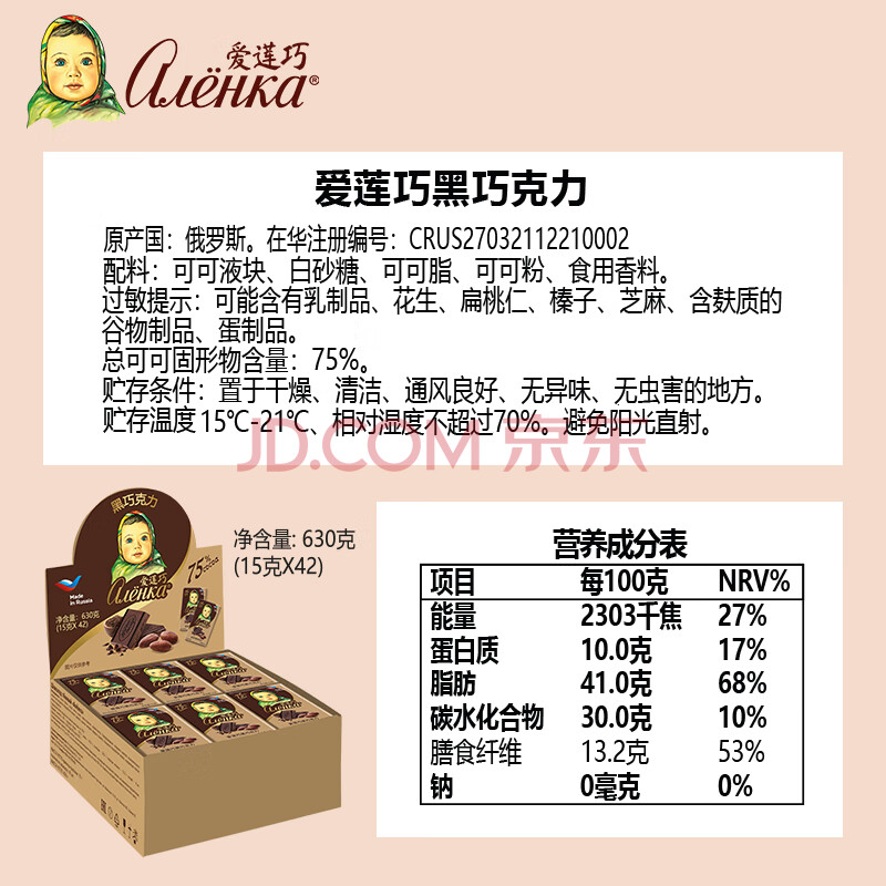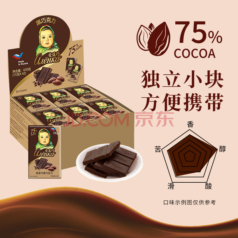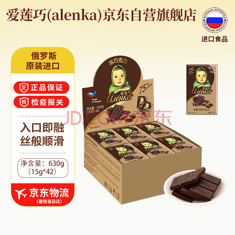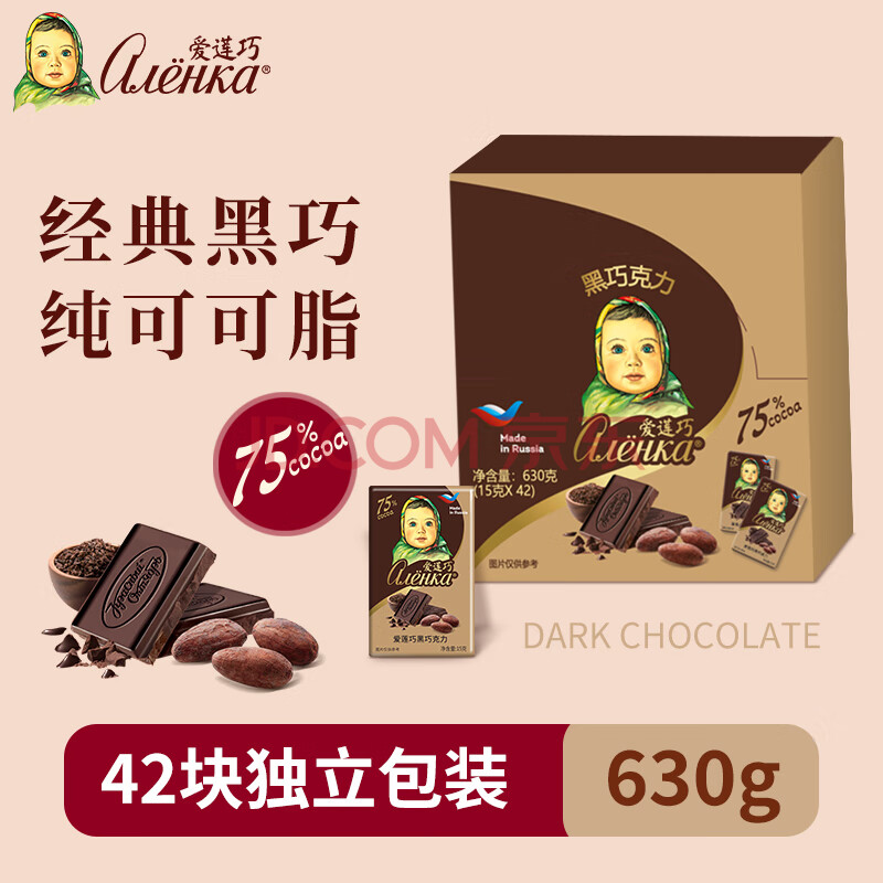 商品名称:爱莲巧75%黑巧15g*42俄罗斯进口巧克力 大头娃娃 休闲零食 下午茶