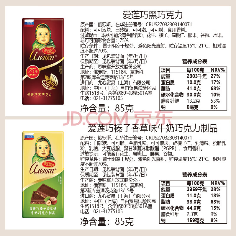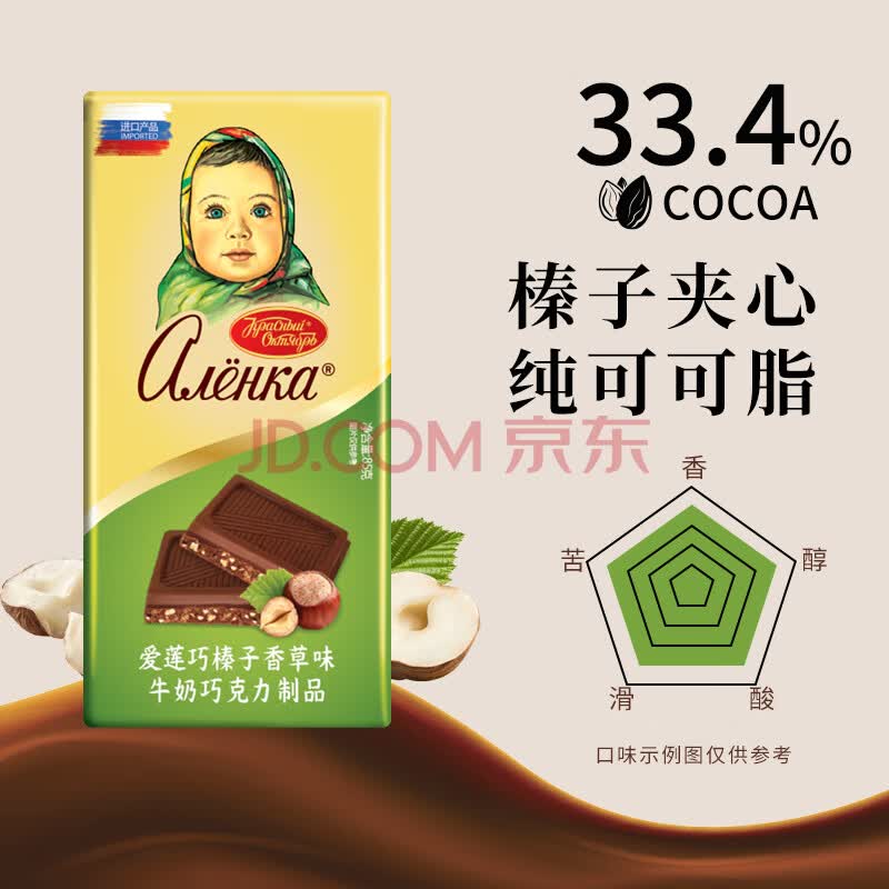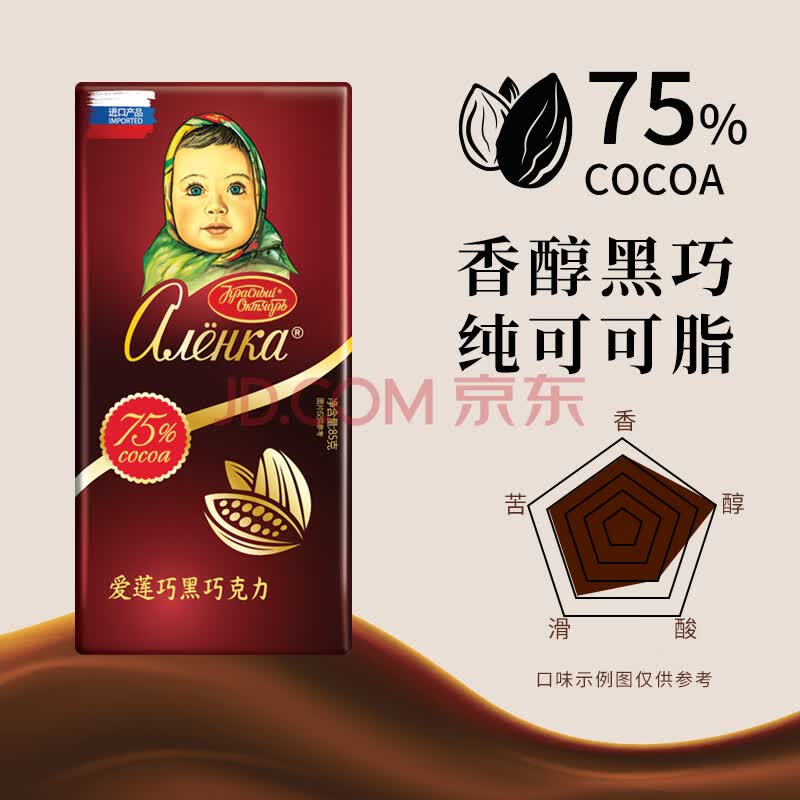 商品名称:爱莲巧(alenka)俄罗斯进口大头娃娃75%黑巧榛子巧克力组合85g*6 下午茶零食