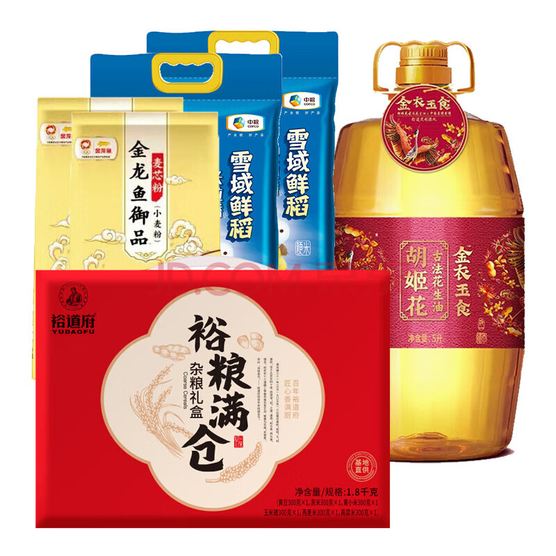 商品名称:胡姬花丰享组合E款 花生油5L 长粒香5kg*2 麦芯粉5kg*2 杂粮礼盒1.8kg