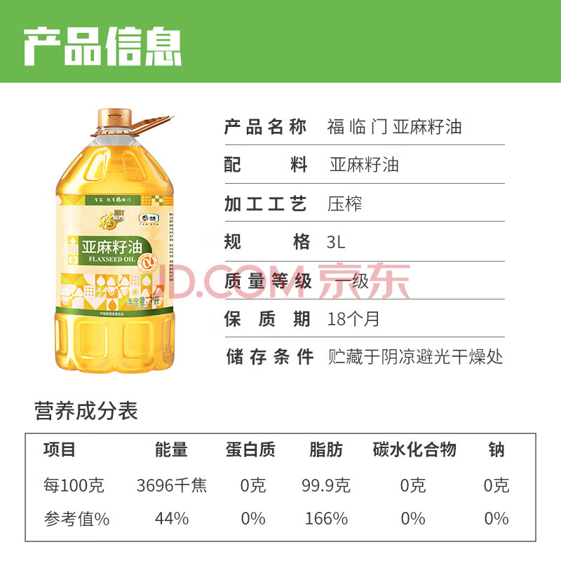 商品名称:福临门 食用油 压榨一级亚麻籽油3L【保真亚麻籽油】 中粮出品