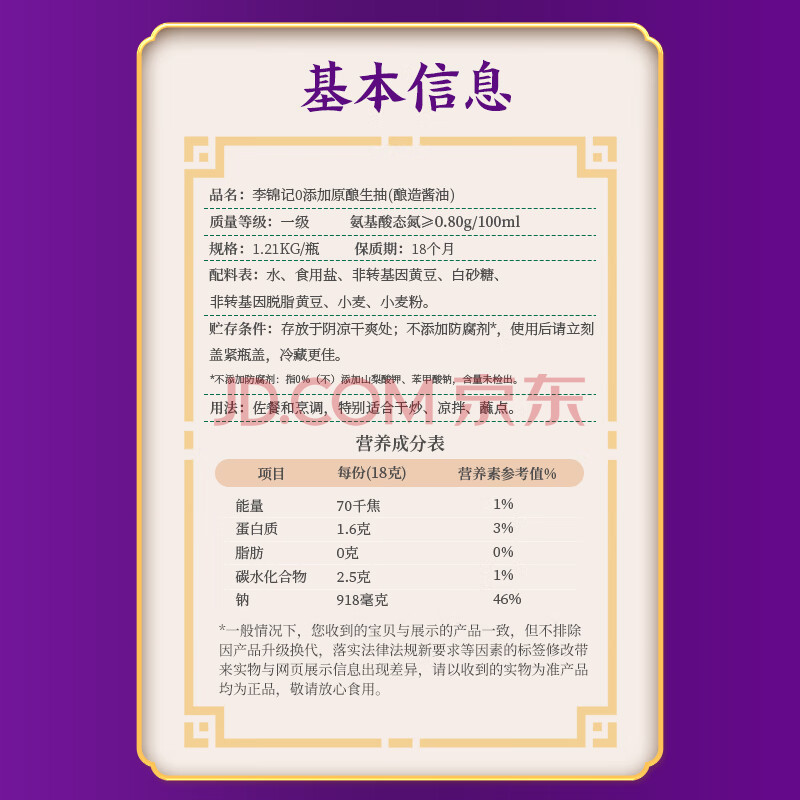 商品名称:李锦记 0添加原酿生抽1.21kg【0添加 一级】安心健康 头道精华 酿造酱油