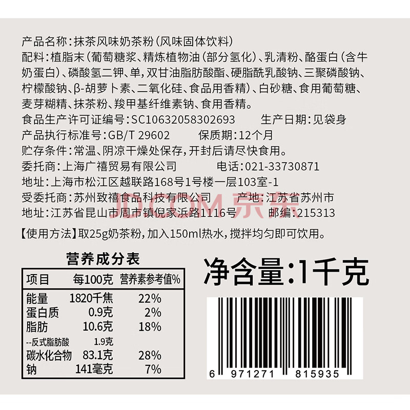 商品名称:广禧优品抹茶风味奶茶粉1kg 饮料速溶抹茶三合一奶茶烘焙专用原料配料