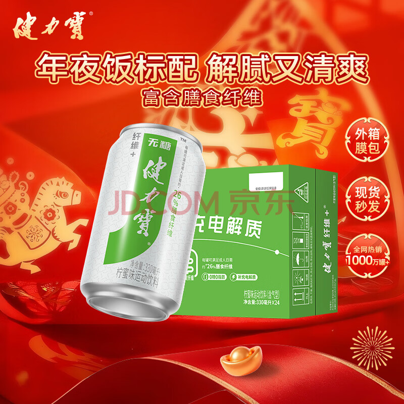 > 健力宝运动碳酸饮料无糖0脂补充电解质膳食纤维+柠蜜味330ml*24