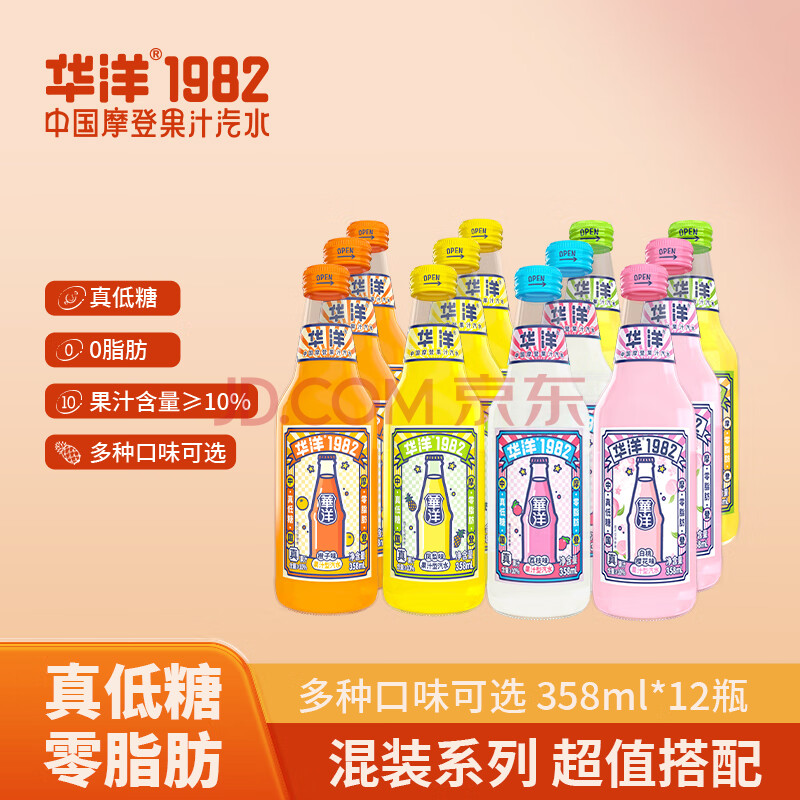 > 华洋1982汽水果味碳酸饮料358ml*12瓶玻璃瓶装低糖0脂网红饮品