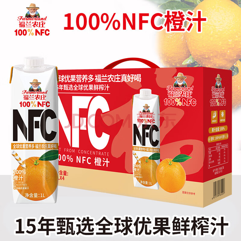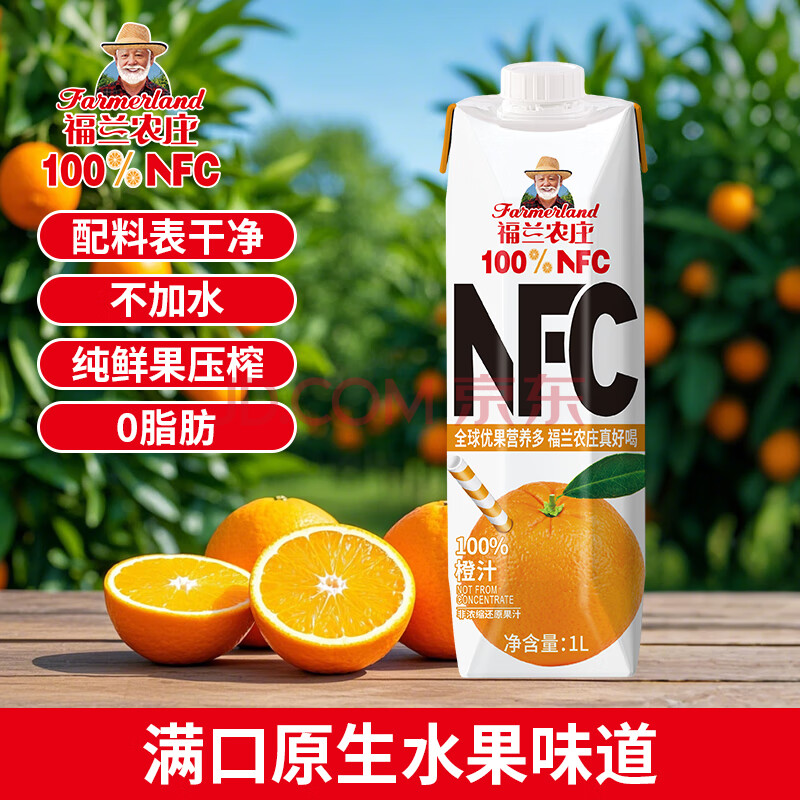 > 福兰农庄NFC橙汁100%鲜榨果汁饮料1L*4瓶配料表干净0脂肪新年年货礼盒