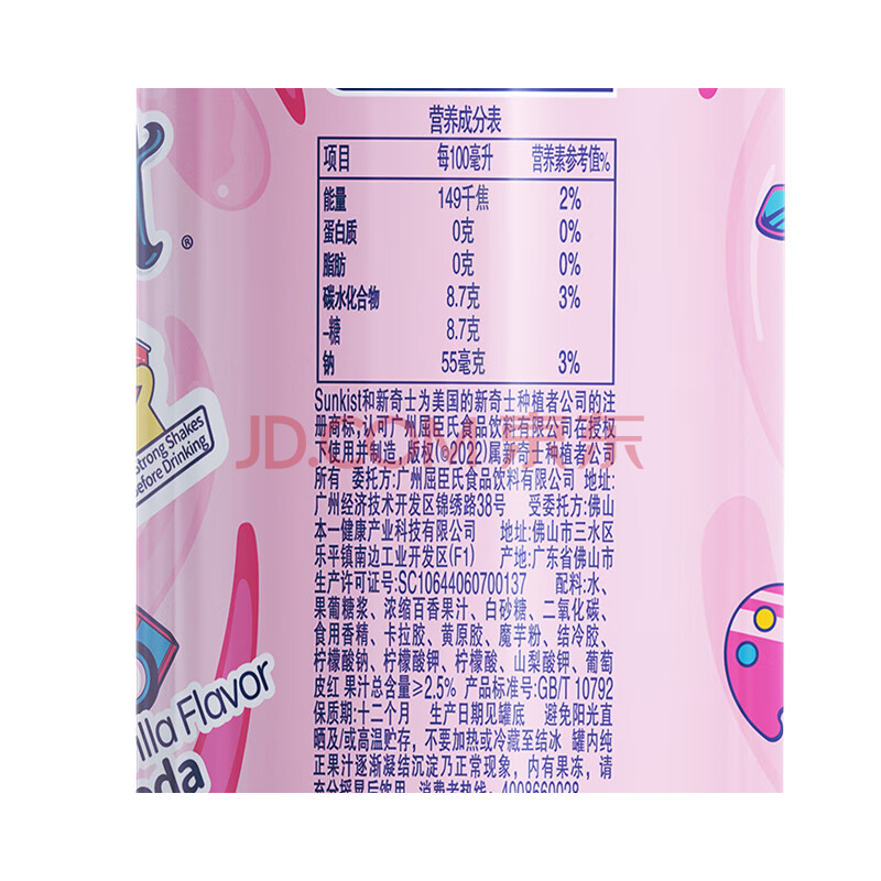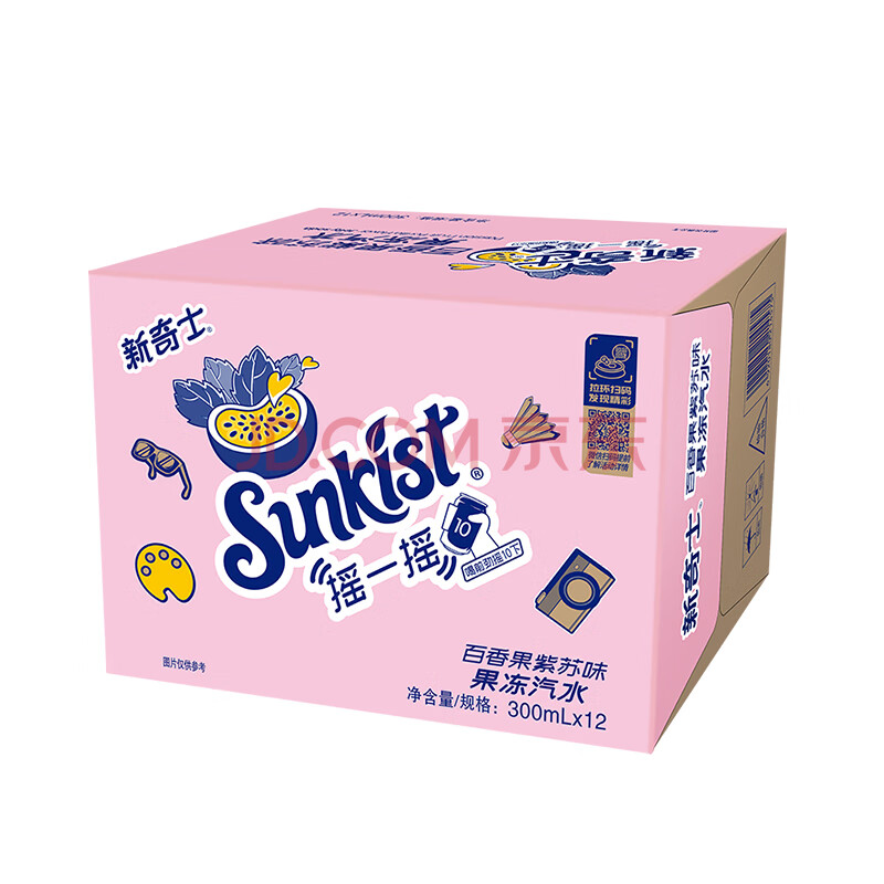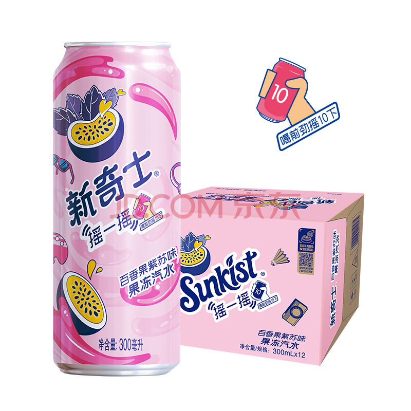 商品名称:屈臣氏(Watsons)新奇士百香果紫苏果冻汽水含NFC果汁碳酸饮料汽水300mL*12罐整箱