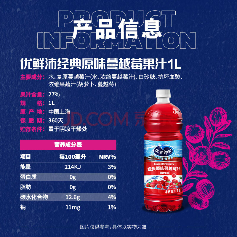商品名称:优鲜沛(Ocean Spray)蔓越莓汁果汁 调酒配方饮料饮品 原味1L