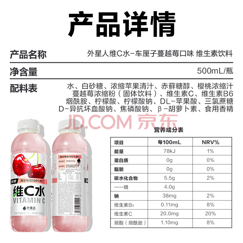 商品名称:外星人【魏晨同款】维C水低糖饮料 车厘子蔓越莓口味 500mL*15瓶 整箱装