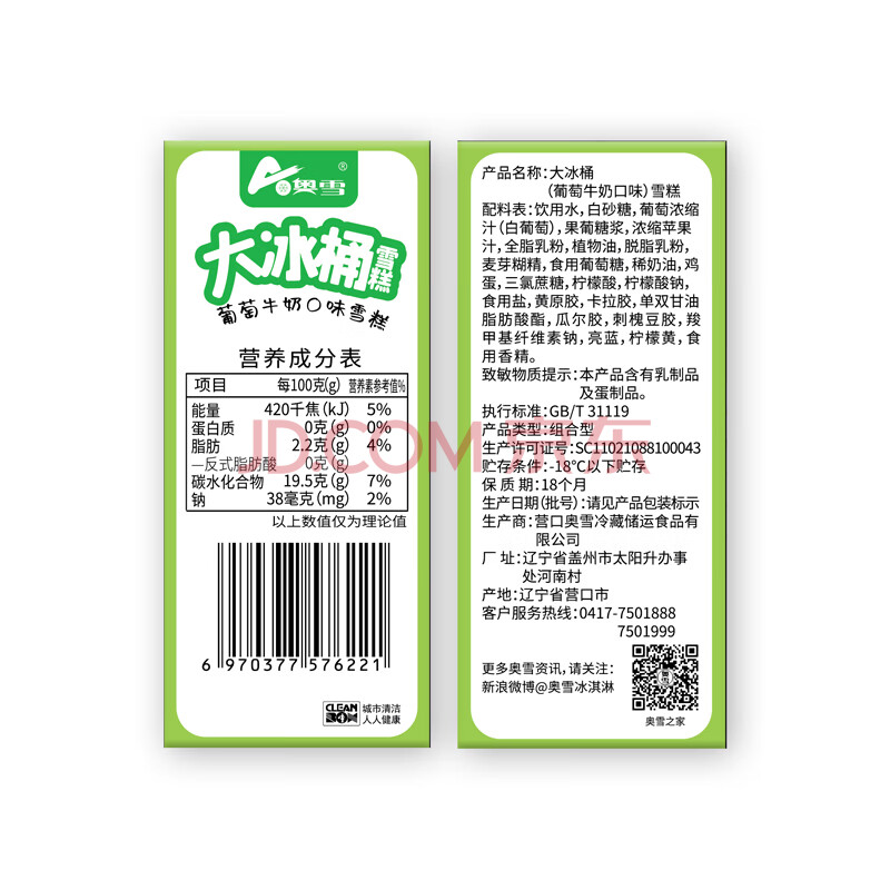 商品名称:奥雪大冰桶 葡萄牛奶口味雪糕 95克*4支/盒 冰淇淋 冷饮 家庭装