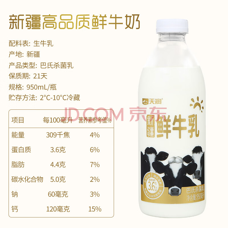 商品名称:天润(TERUN)新疆产地 鲜牛奶巴氏杀菌鲜奶 低温奶 早餐伴侣950ml*1瓶