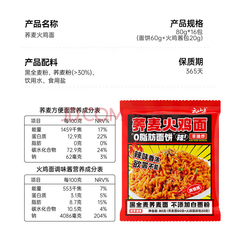商品名称:云山半荞麦火鸡面0脂肪荞麦方便面荞麦干拌面方便速食品泡面袋装80g*16