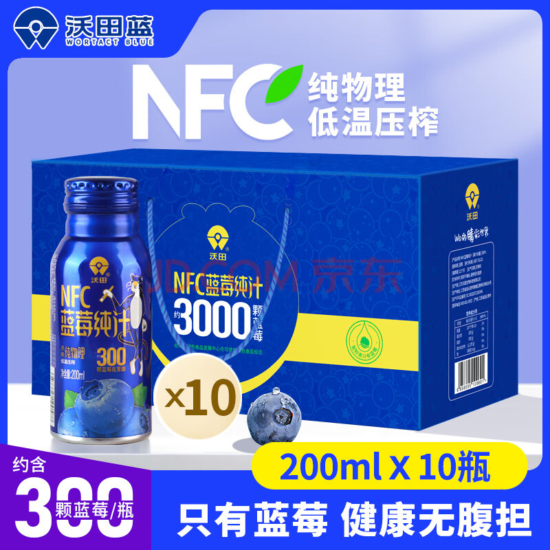 沃田NFC蓝莓汁100%纯果汁儿童花青素饮料蓝莓果汁节日礼品 200ml*10瓶