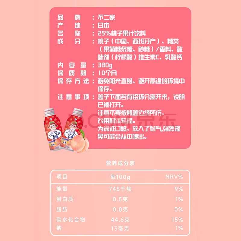 商品名称:不二家(FUJIYa)日本进口果汁饮料果汁含量25%休闲饮品儿童饮料白桃味380g*24