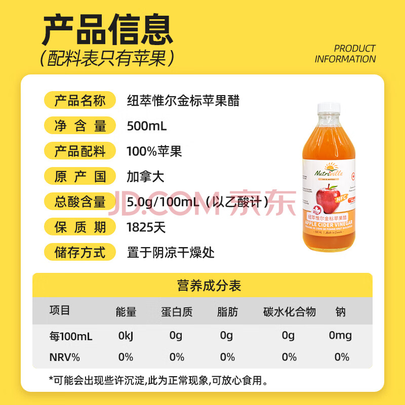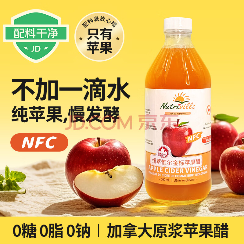商品名称:纽萃惟尔加拿大进口苹果醋原浆500ml配料干净健身冲调饮料果醋食醋0糖0脂