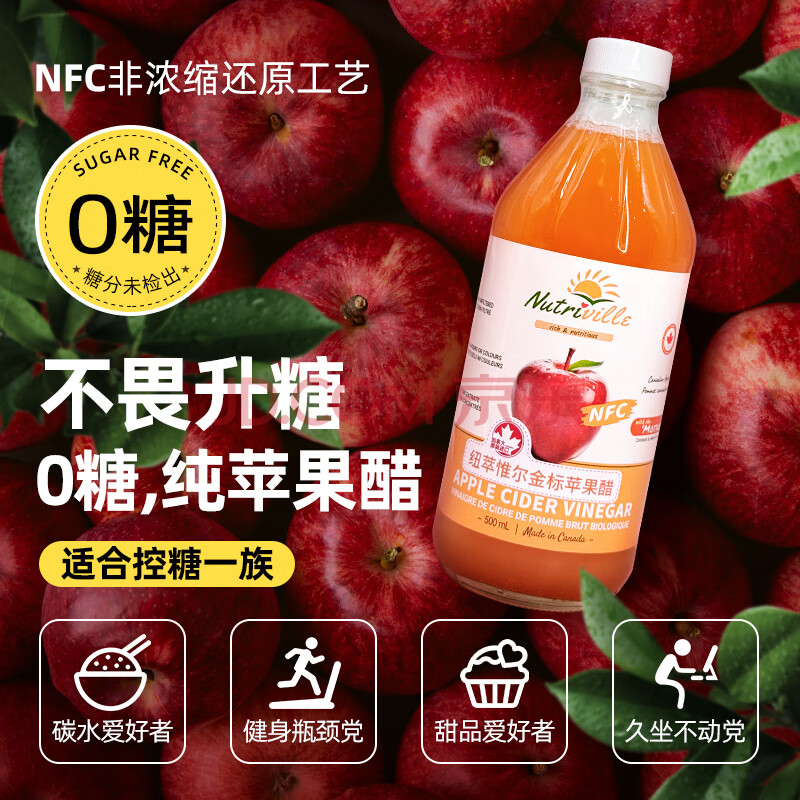> 纽萃惟尔加拿大进口苹果醋原浆500ml配料干净健身冲调饮料果醋食醋0糖0脂