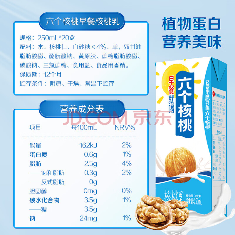 商品名称:养元六个核桃早餐核桃乳250ml*20盒植物蛋白饮料 整箱装