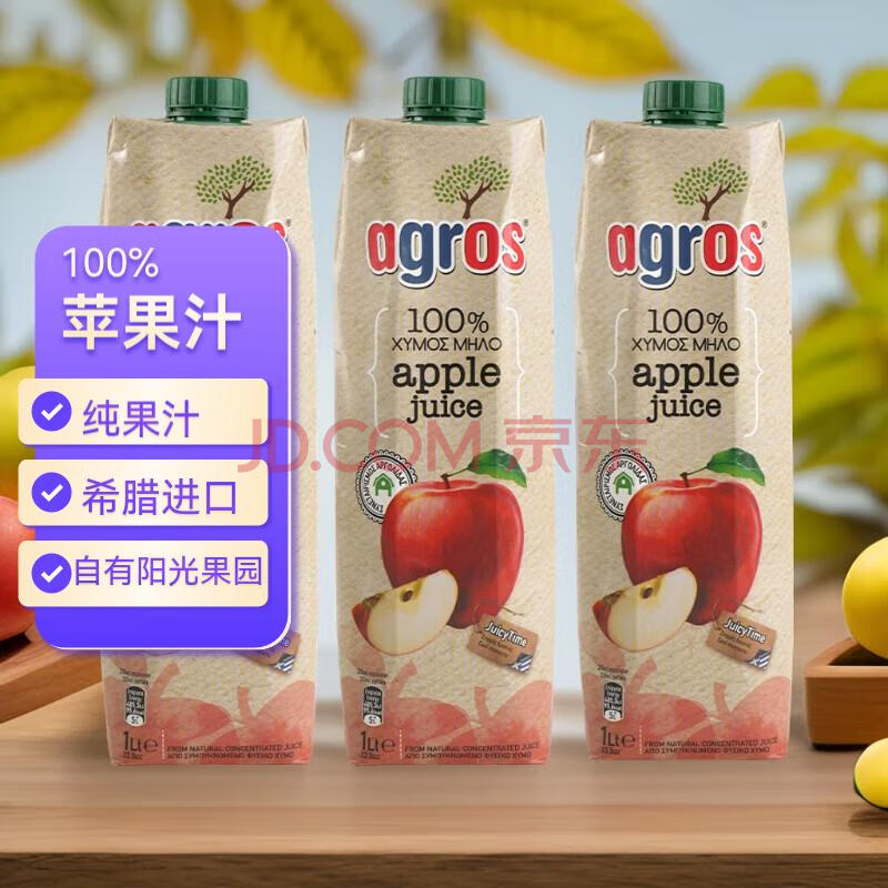 > 莱果仕100%苹果汁饮料1L*3 希腊进口大瓶装纯果汁来自欧洲阳光果园