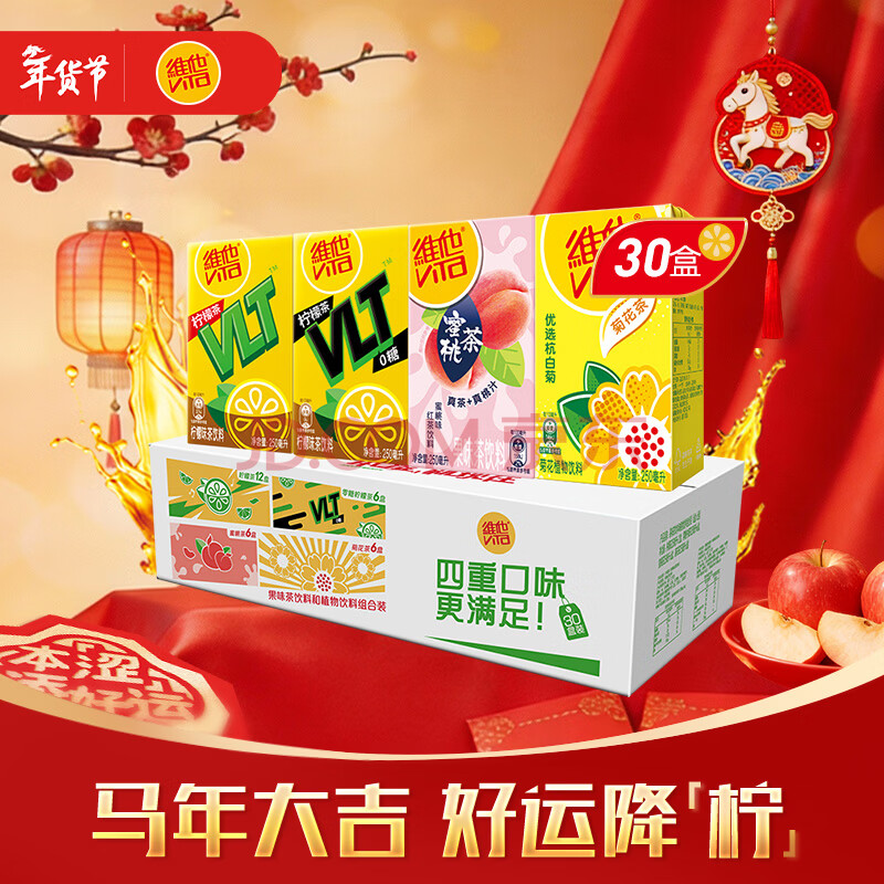 > 维他奶 果味茶饮料植物饮料4口味250ml*30盒 原味12/蜜桃6/零糖6/菊花6