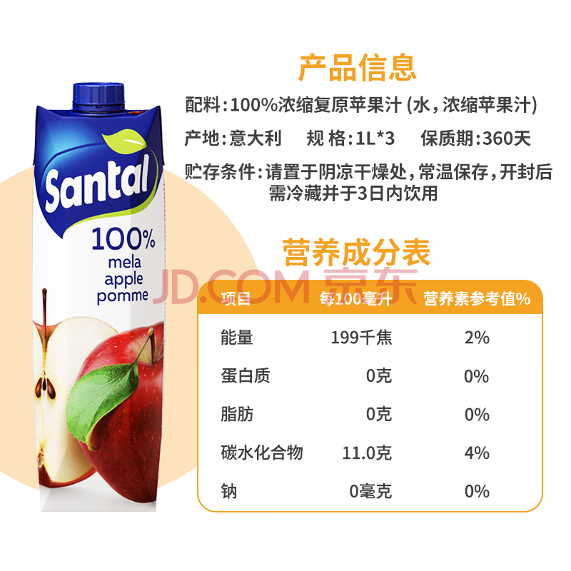 商品名称:圣涛(SANTAL)帕玛拉特意大利100%苹果汁1L*3瓶进口纯果汁饮料果蔬汁好礼