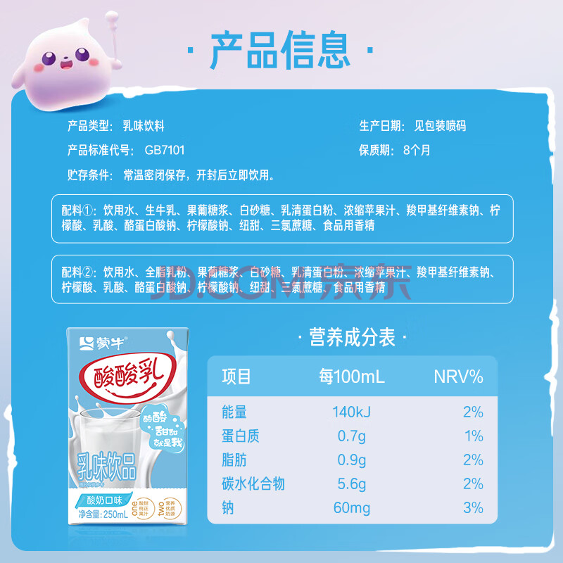 商品名称:蒙牛酸酸乳乳味饮料酸奶味250ml*24盒 送礼盒装 乳味饮品