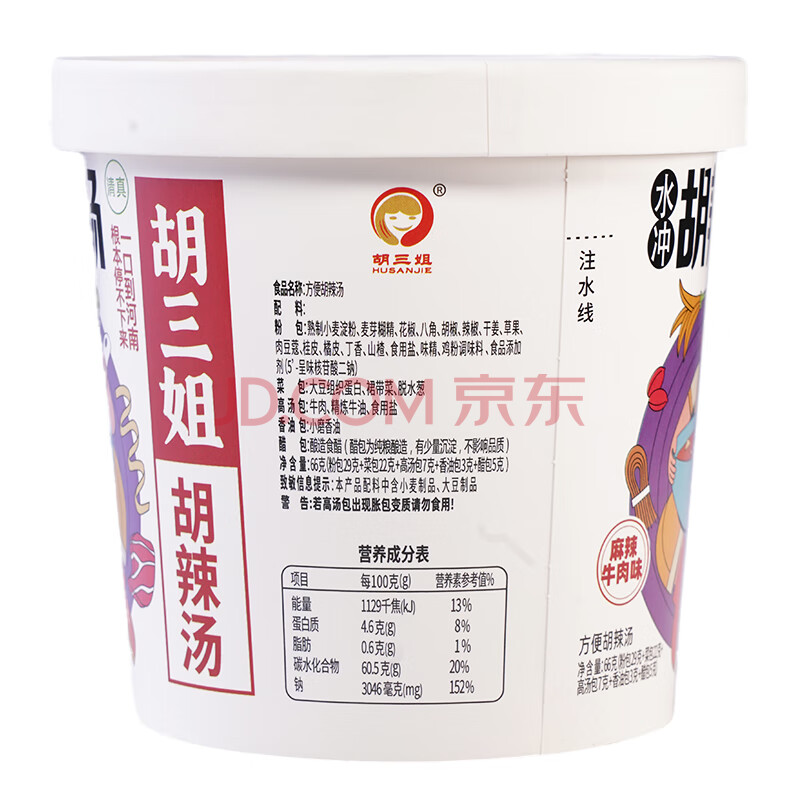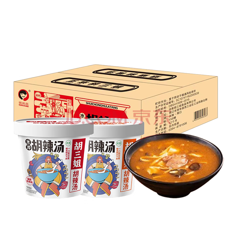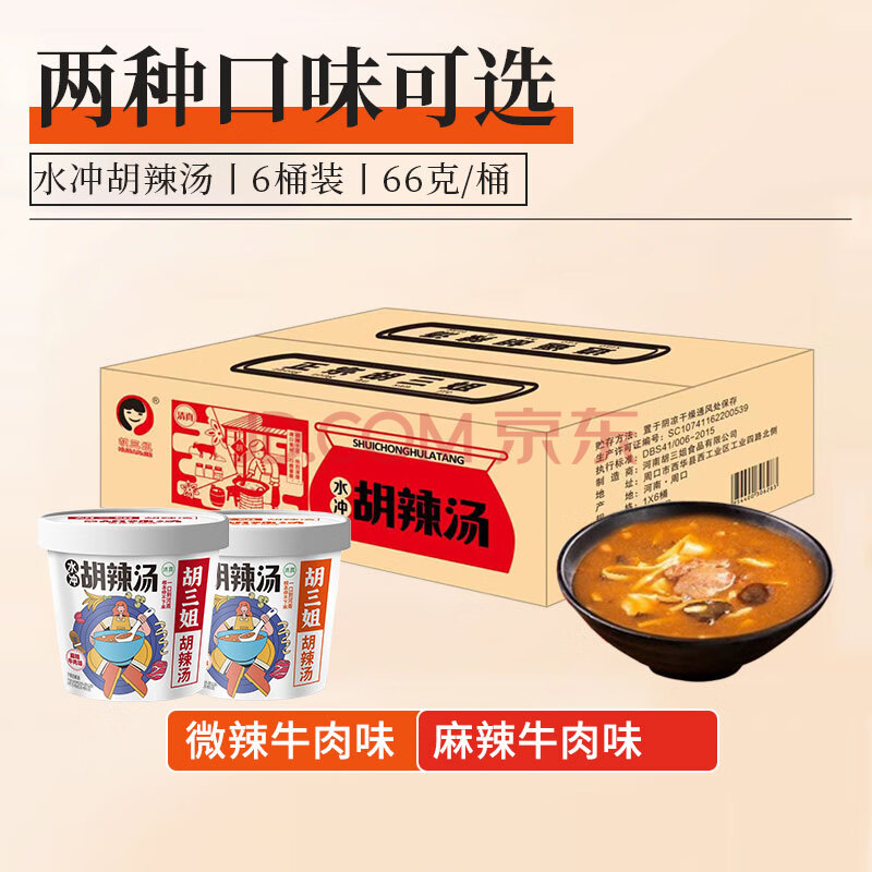 商品名称:胡三姐(HUSANJIE)水冲胡辣汤河南特产麻辣牛肉味66g*6桶 整箱装 方便速食清真早餐