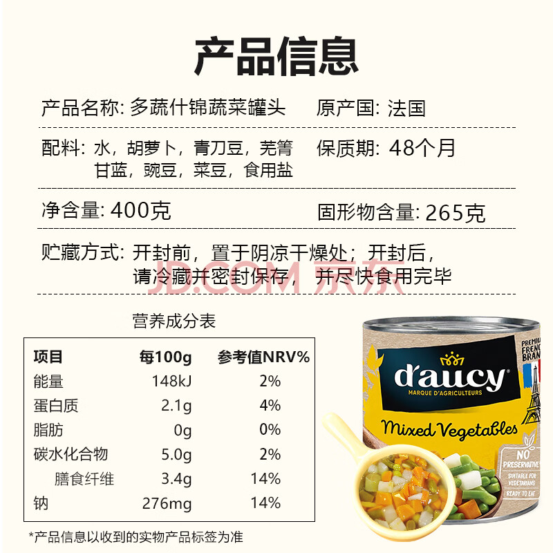 商品名称:多蔬法国进口什锦蔬菜罐头400g 无添加蔬菜沙拉西餐方便速食酱腌菜