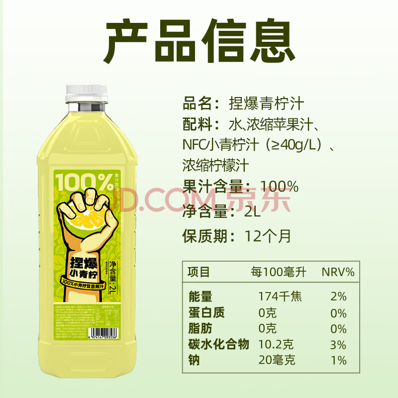 商品名称:哪吒捏爆100%青柠汁2L聚会火锅饮料0添加糖0脂维C纯果汁饮品实惠大桶