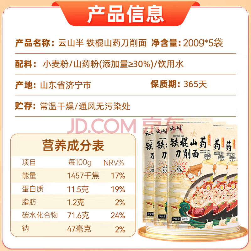 商品名称:云山半铁棍山药刀削面200g*5袋 低脂肪山药挂面 面条宽面拌面 方便速食