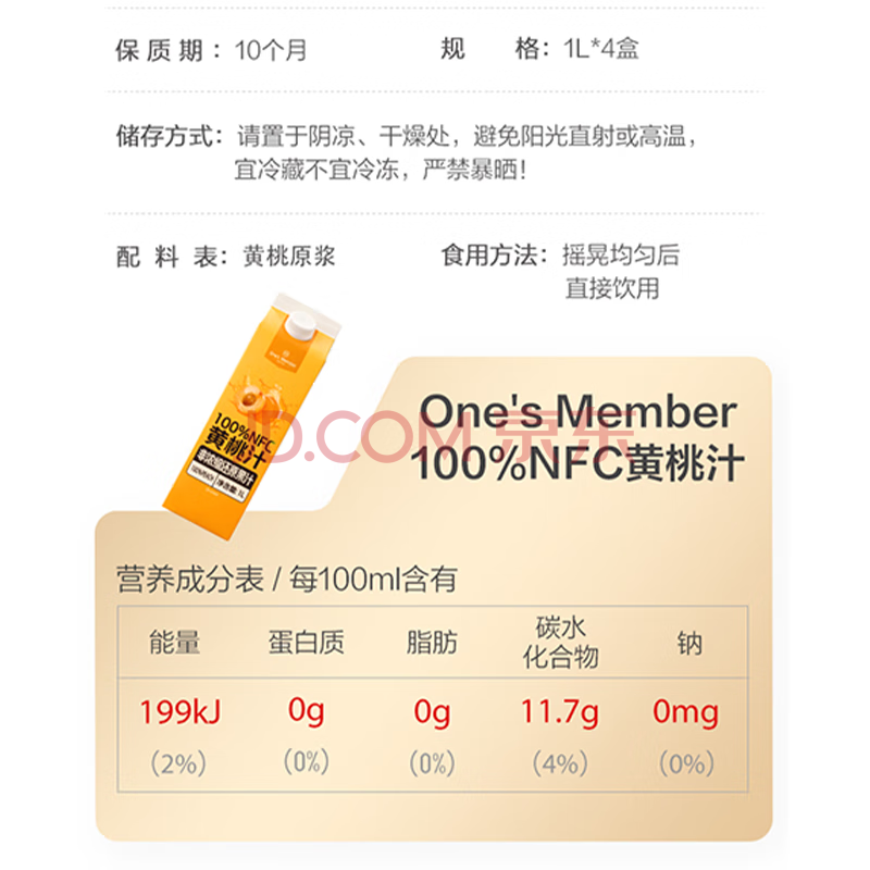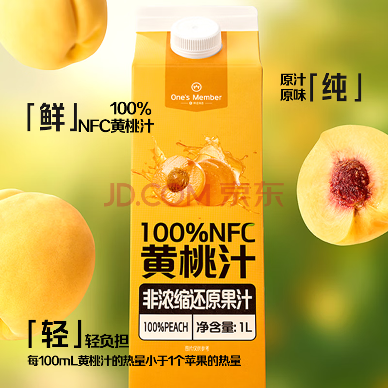 商品名称:1号会员店100%NFC黄桃汁 0脂0添加纯果蔬汁鲜果水果榨汁饮品饮料1L*4整箱装
