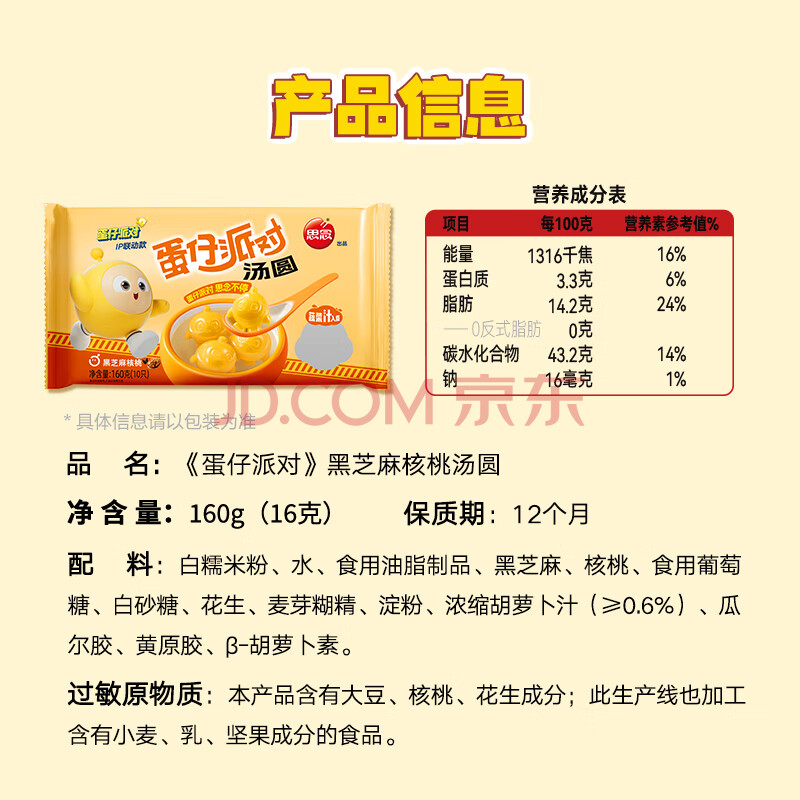 商品名称:思念蛋仔派对汤圆黑芝麻核桃160g10颗 黑芝麻甜品早餐