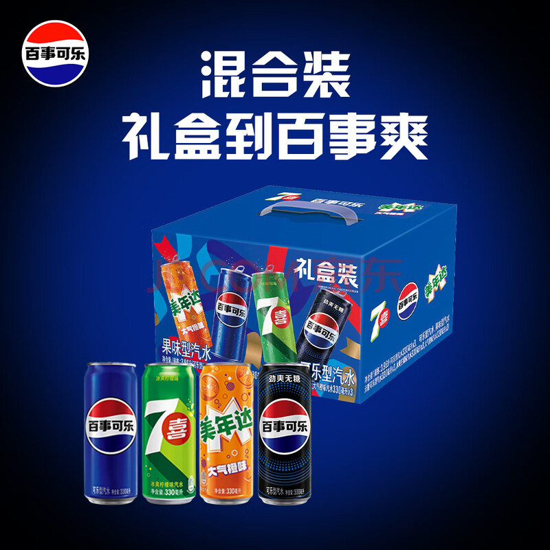 商品名称:百事可乐Pepsi 碳酸饮料汽水混合装 330ml*12听细长罐整箱装 家庭送礼礼盒