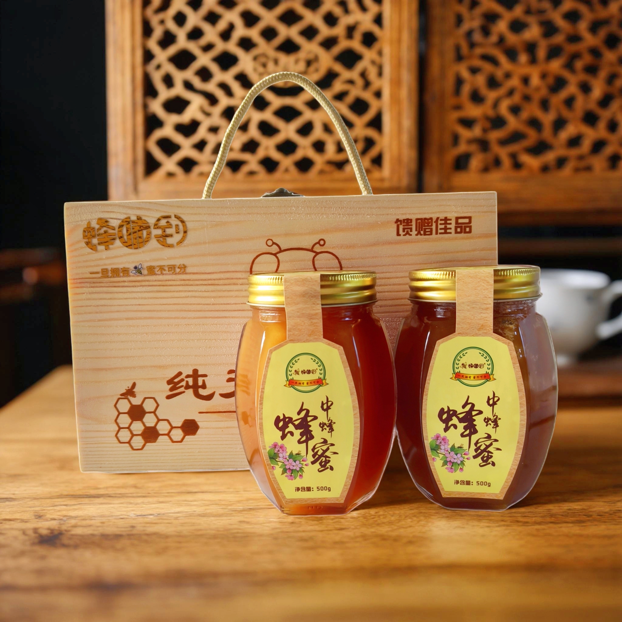 商品名称:凌云中蜂蜂蜜礼盒(木盒)500*2瓶 /FX
