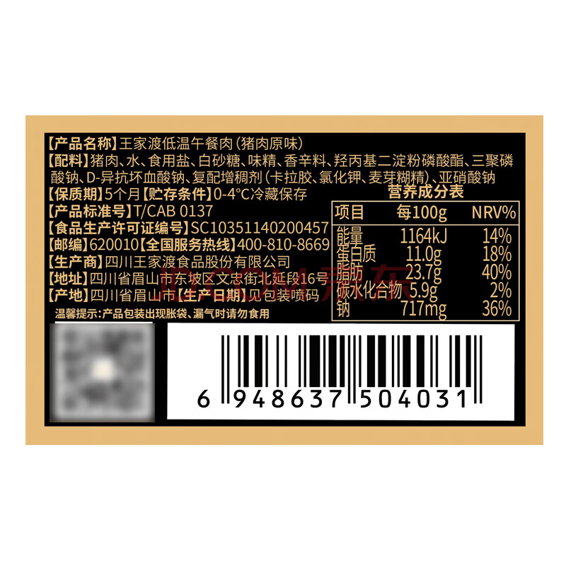 商品名称:王家渡低温午餐肉原味198g即食早餐三明治香肠肉肠烧烤火锅食材方便速食
