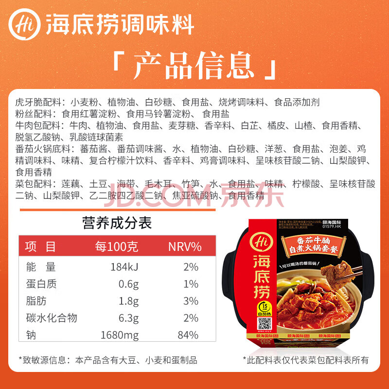 商品名称:HI 海底捞番茄牛腩自煮火锅365g*2 自煮方便速食食品