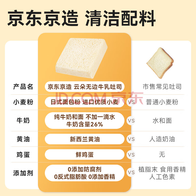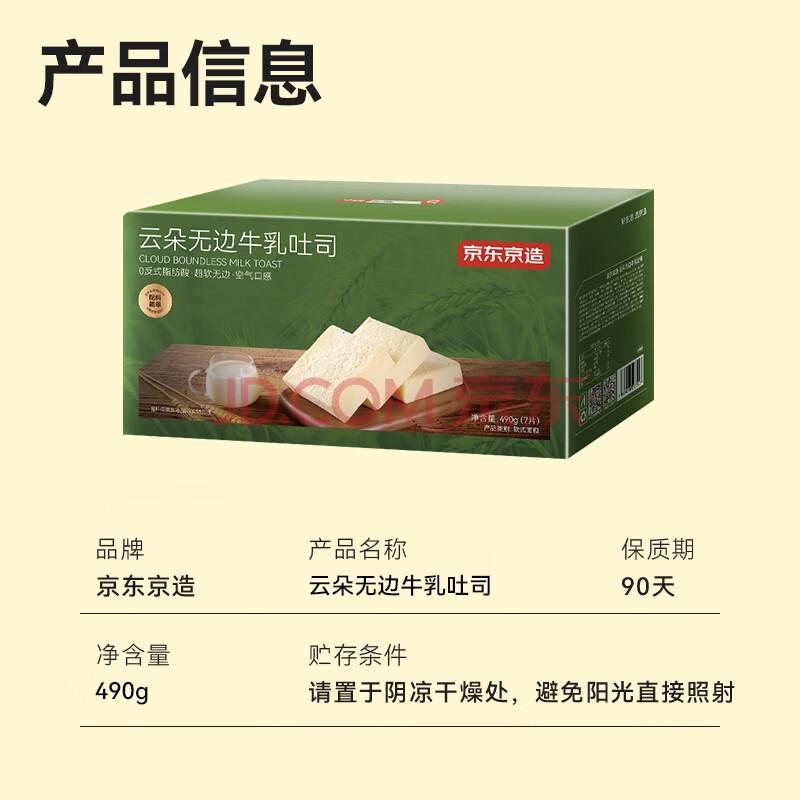 商品名称:京东京造牛乳无边厚切吐司490g面包早餐糕点心充饥代餐零食0添加防腐剂