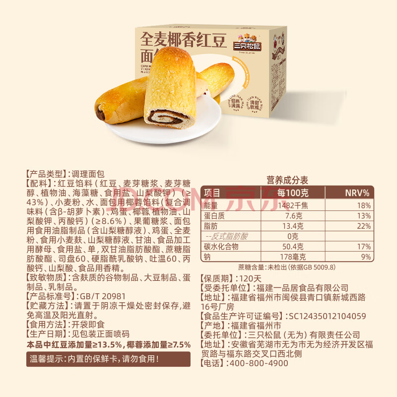 商品名称:三只松鼠全麦椰香红豆卷1000g 全麦面包吐司小蛋糕早餐休闲零食糕点点心