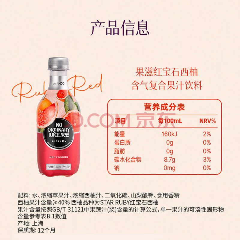 商品名称:DRINKNOD果滋含汽果汁355ml*15气泡水饮料红宝石西柚汁