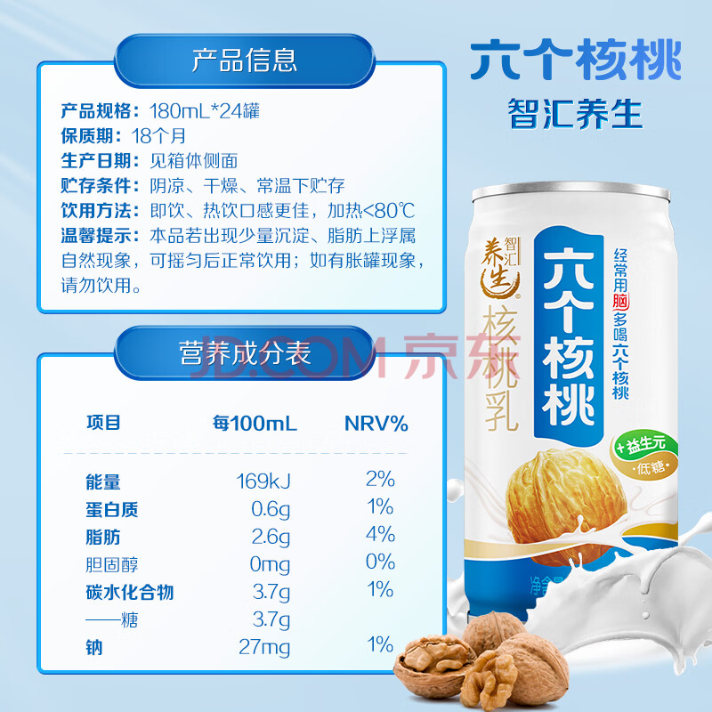 商品名称:养元六个核桃智汇养生型180ml*24罐量贩实惠核桃乳饮料 整箱装