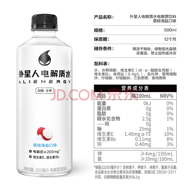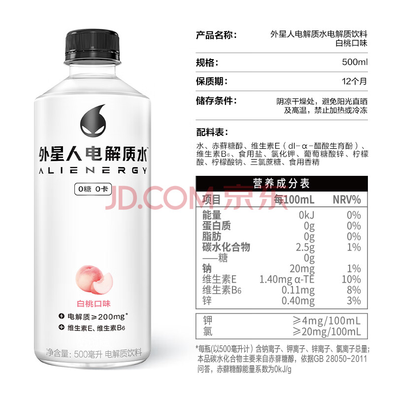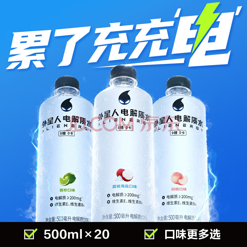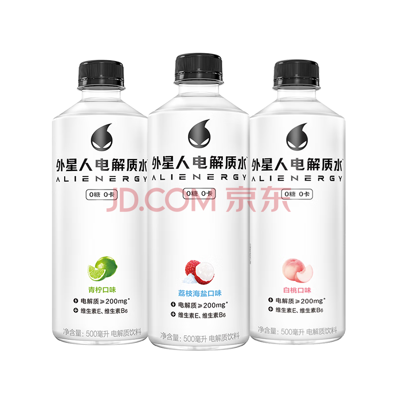 商品名称:外星人电解质水0糖0卡饮料 500mL*20 荔枝海盐*6+白桃*6+青柠*8 整箱装