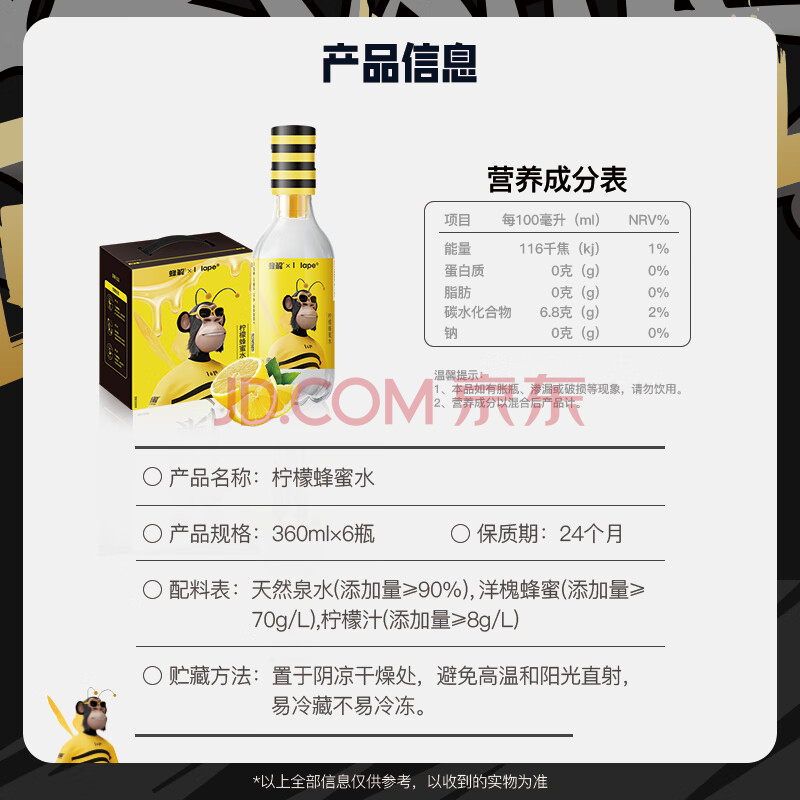 商品名称:蜂解柠檬蜂蜜水【hape联名】0色素0香精 解腻果蔬汁饮品饮料360g*6瓶
