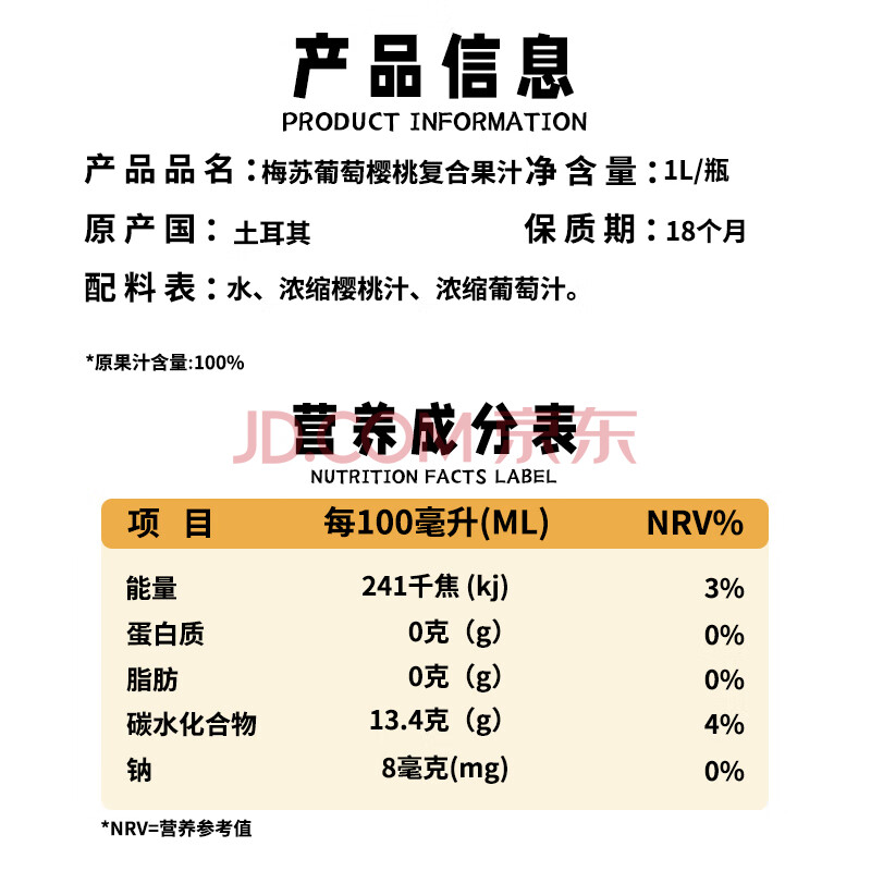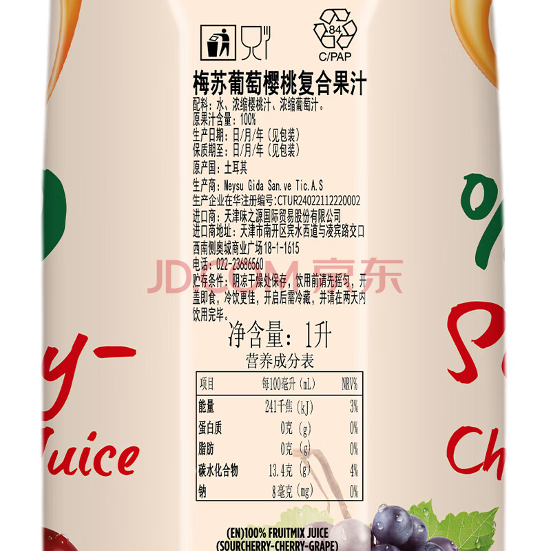 商品名称:梅苏土耳其进口100%葡萄樱桃复合果汁1L*4饮料聚会 果蔬汁 饮品囤年货