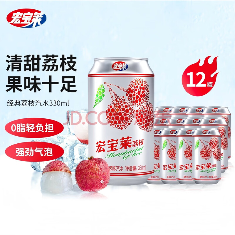 商品名称:宏宝莱荔枝味汽水经典碳酸饮料330ml*12罐东北老汽水怀旧果味饮品