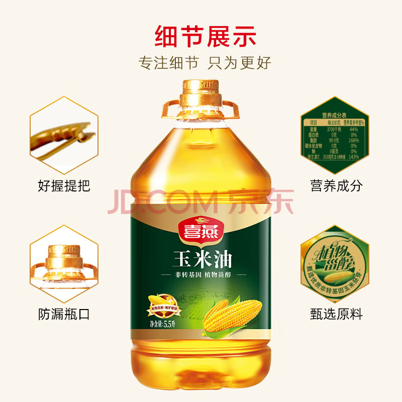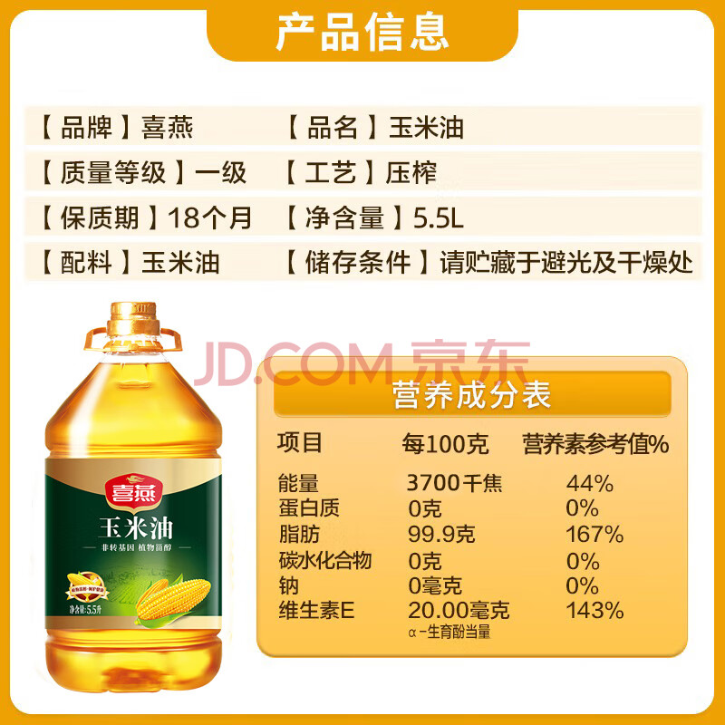 商品名称:喜燕玉米油物理压榨一级食用油5.5L清新不油腻粮油植物油胚芽油