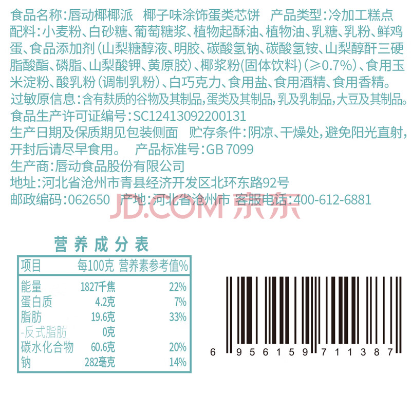 商品名称:唇动椰椰派4枚装120g早餐面包休闲小零食