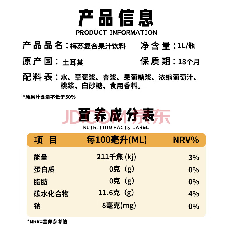 商品名称:梅苏 土耳其原装进口 复合果汁饮料1L*4 聚会果蔬汁休闲饮品 年货送礼